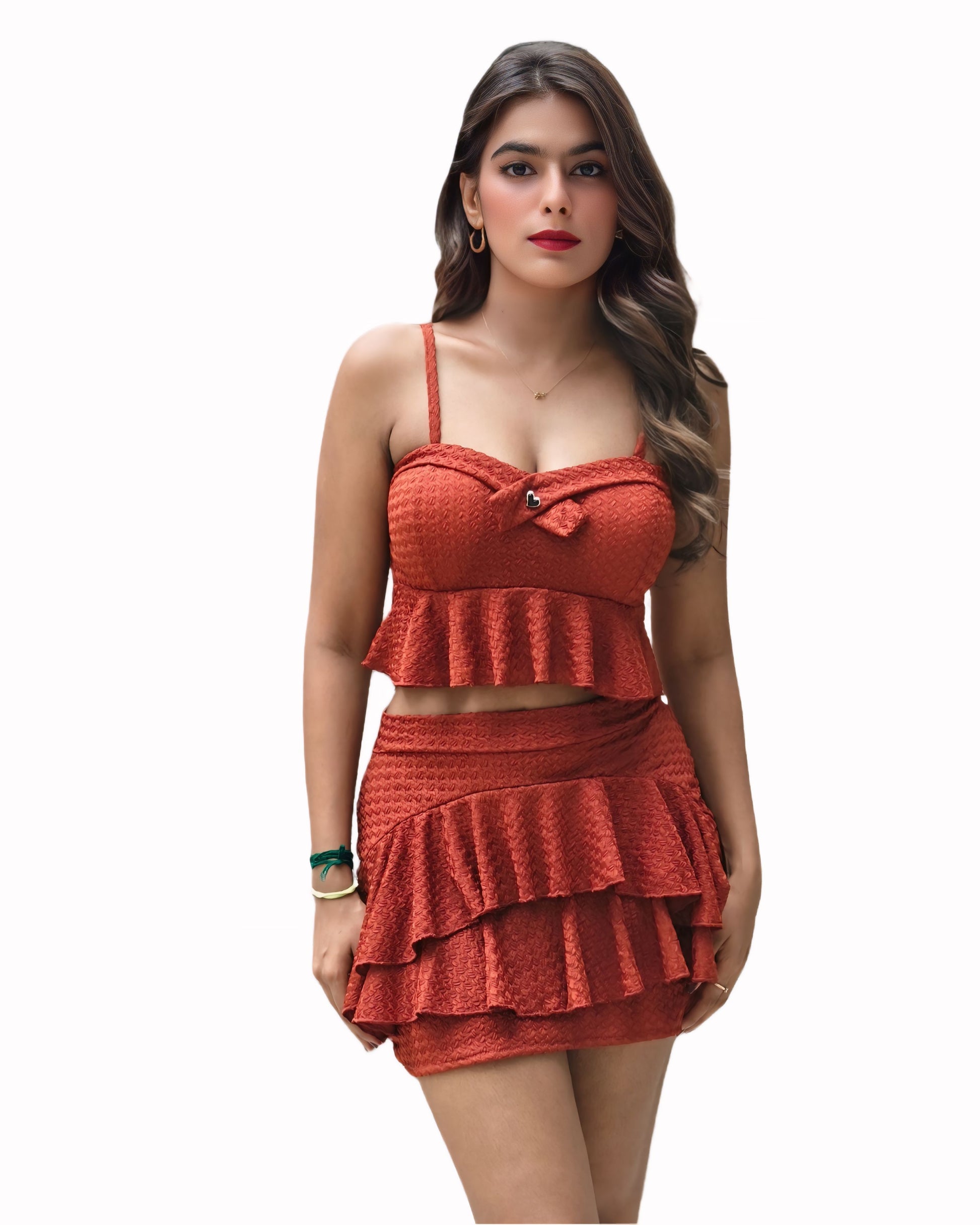 Style with this chic Brown Crop Top and Mini Skirt Set. This trendy two-piece ensemble features a flattering crop top and a coordinating mini skirt, both designed to create a chic and modern silhouette. The versatile brown hue complements a variety of skin tones, making it a perfect choice for any occasion. Whether you're heading to a party, a date night, or a casual outing with friends, this set is sure to turn heads.
