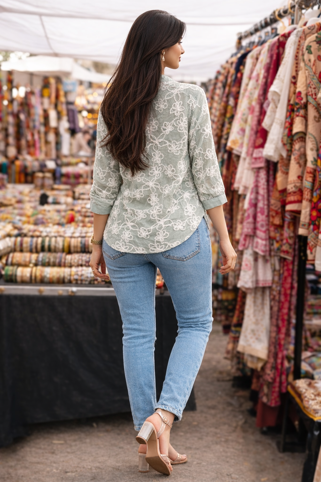 Voxelle Sage Bloom Embroidered Top, crafted for women who love effortless elegance. Made from soft, breathable cotton, this top features delicate white floral embroidery that adds a refined, feminine charm.